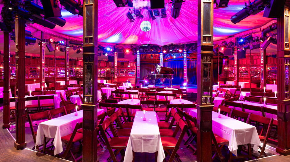 To ensure you can dine at leisure, doors open at 18:30 Monday to Saturday (Sundays at 17:30). Menu service begins 15 minutes after admission. Starters and the main course are served before the show, dessert is served during intermission.